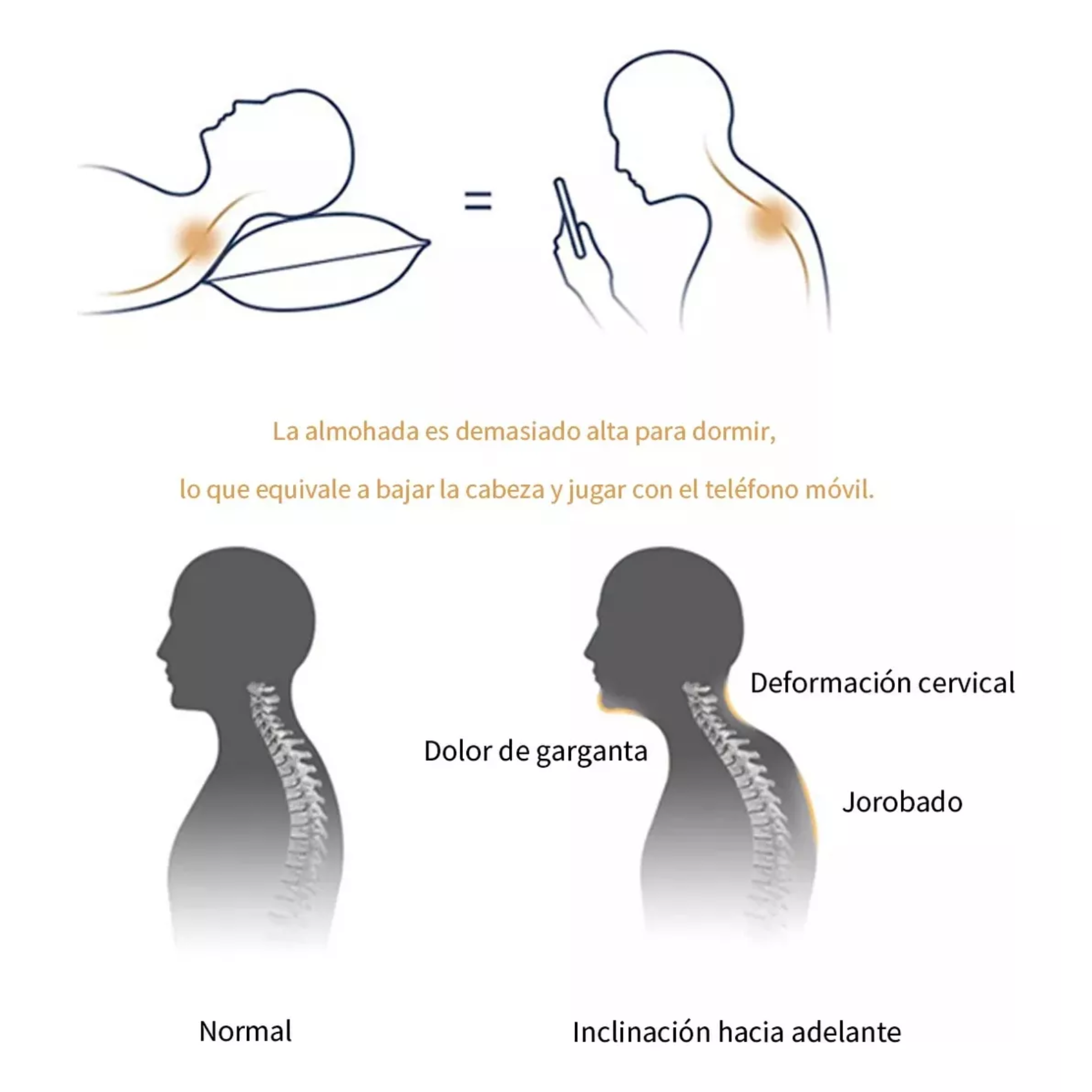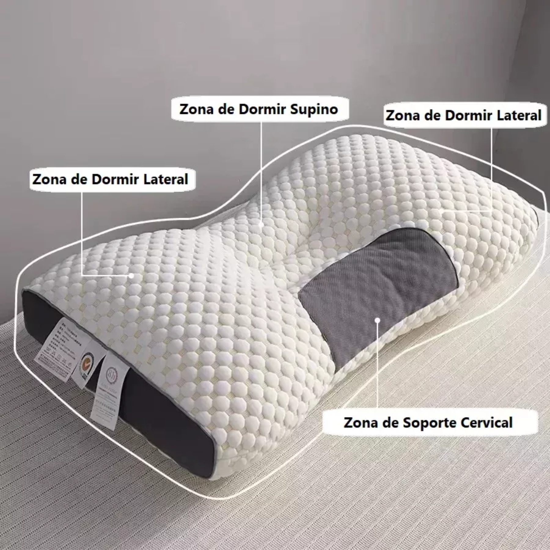 Soporte Cervical Óptimo: Diseñada específicamente para mantener la curvatura natural del cuello y la columna, aliviando dolores y promoviendo una postura adecuada mientras duermes.