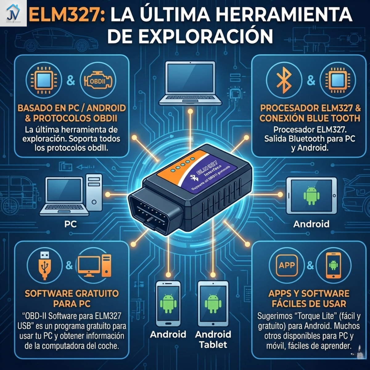 El procesador es un elm327. El protocolo de salida (conexión al portátil) es Blue Tooth para PC y Android.